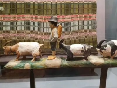Träskulptur föreställande pojke och getter av Bror Rosin. Väv i bakgrund vävd av bröderna Pehr Pehrsson och Zachris Pehrsson - 5/5