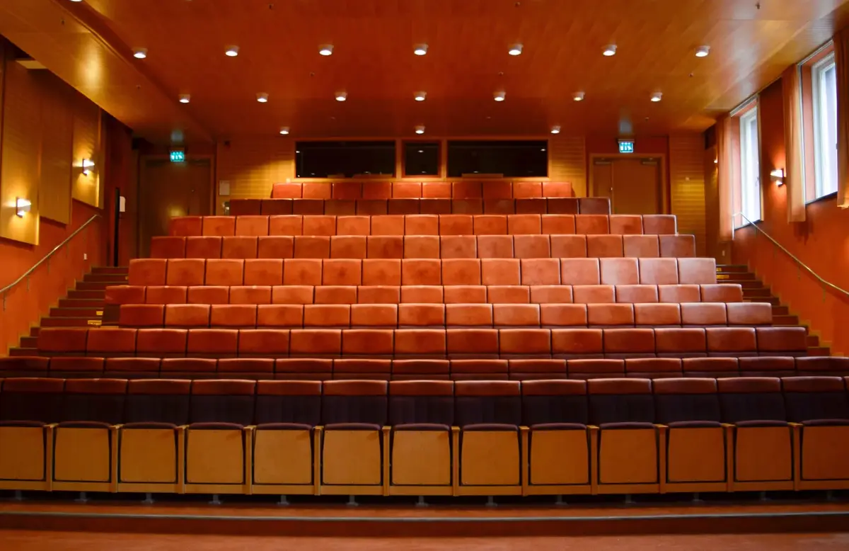 Hörsalen är, precis som resten av huset, ritad av arkitekterna Gunnar Matsson och Tina Wik. Interiören är en tidskapsel från 1990-talet med sina svampamålade aprikosfärgade väggar och inredning i björk.